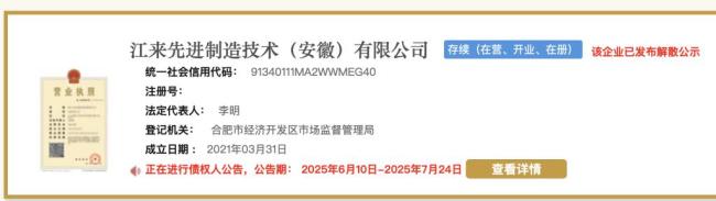 蔚来与江淮汽车的合资公司江来先进制造技术(安徽)有限公司宣告注销。根据国家企业信用信息公示系统,该公司于2021年3月31日成立,注销原因是“决议解散”。