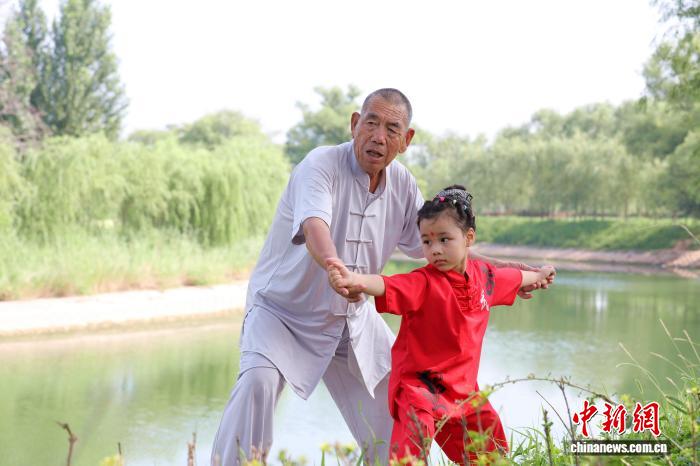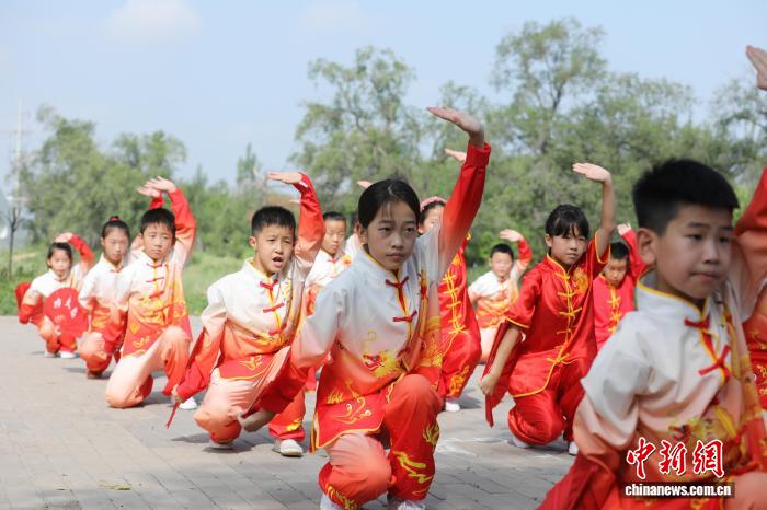 图为7月24日,沧县曹庄子小学学生在大运河畔学习传统武术。田博 摄