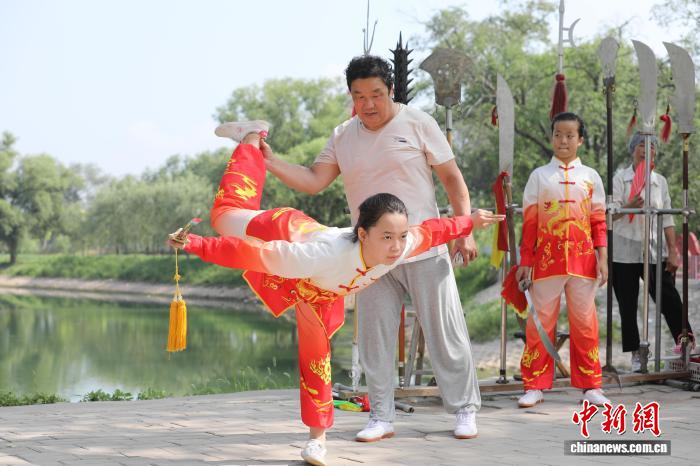 图为7月24日,武术老师在大运河畔指导沧县曹庄子小学学生练习传统武术。田博 摄