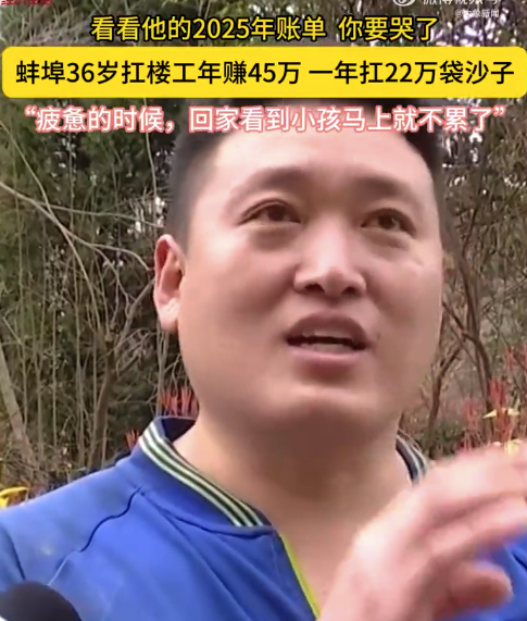 近日,安徽蚌埠的36岁扛楼工杨晨用铁肩扛起家庭重担。2025年,杨晨年收入超45万,如果用70斤一袋的沙包衡量,相当于一年跑二楼扛了22万袋沙子。“三四十摄氏度高温的时候,真的很难受,休息一会想想还是要坚持下去。虽然干活的过程是枯燥的,但结果是美好的。”杨晨说,疲惫的时候回家看到小孩,马上就不累了。“今年的目标是挣够50万,回老家建一个房子,还要再继续加把劲。”他用双手撑起了自己的小家,也扛起了这世间最滚烫、最真实的人间烟火。妻子哽咽表示:很多人感觉钱挺好挣的,但只有我们自己知道,这个钱是怎么苦出来的。