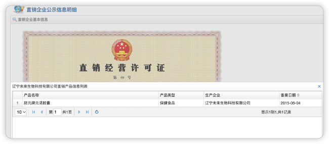 此外,蓝鲸新闻记者注意到,根据商务部直销行业管理网站公示信息,未来生物于2015年获批直销经营许可,但获准直销的产品仅有一款保健食品——胚元牌元诺胶囊。