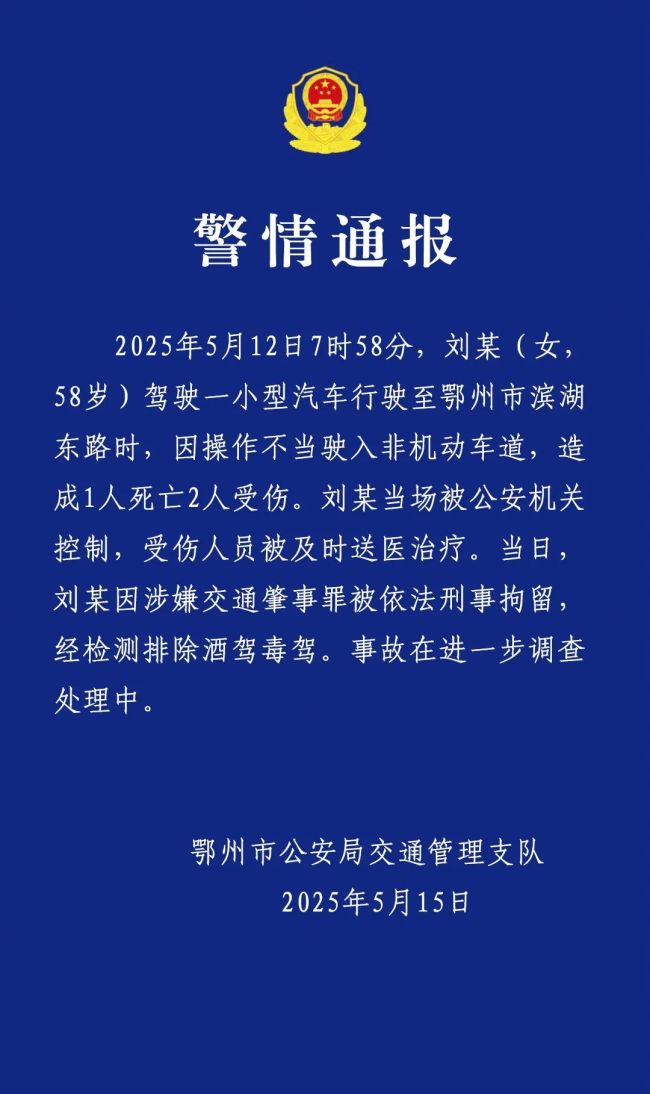 鄂州市公安局交通管理支队在5月15日凌晨发布警情通报称,2025年5月12日7时58分,刘某(女,58岁)驾驶一辆小型汽车行驶至鄂州市滨湖东路时,因操作不当驶入非机动车道,导致1人死亡、2人受伤。刘某当场被公安机关控制,受伤人员被及时送医治疗。当日,刘某因涉嫌交通肇事罪被依法刑事拘留,经检测排除酒驾毒驾。事故正在进一步调查处理中。
