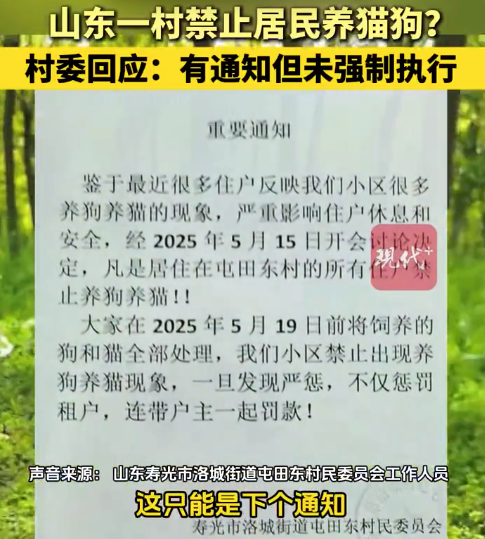 近日,有网友反映,山东寿光市一村委发通知,禁止当地所有居民养猫养狗,已经养了的也必须处理掉。5月19日,涉事村委会向记者回应,确实发了通知,通知内容是经过村民代表开会讨论后形成的,但没有强制执行,也没有明确处罚措施,只是给村民提个醒。