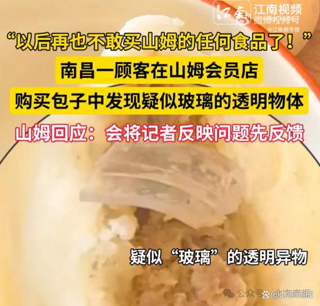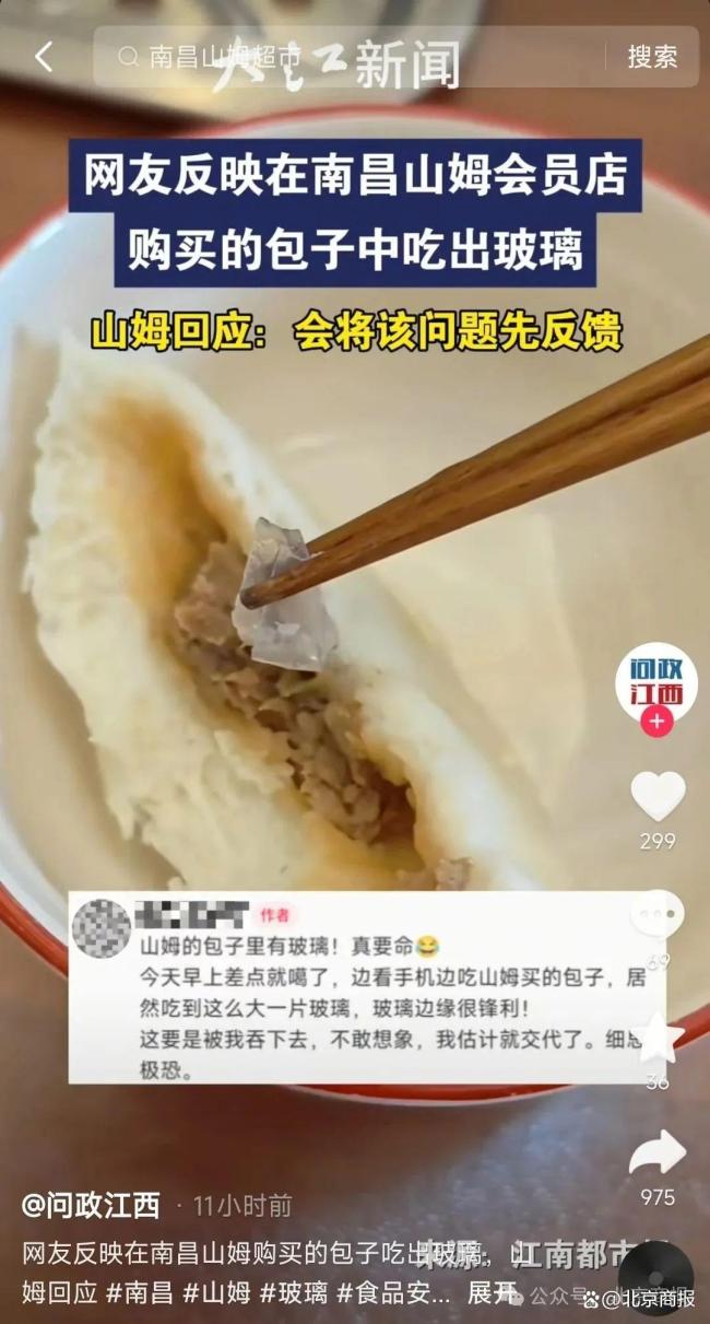 南昌市民徐女士表示,5月19日,她的丈夫在吃从山姆会员店购买的鲜肉包子时,发现疑似玻璃的透明异物。该产品为“鲜美肉包”,售价48.9元/袋,内含20个包子,生产日期标注为2025年3月13日,保质期为12个月。包装上写着“馅料饱满,纯手工包制”,并说明该产品由山姆会员店及沃尔玛(中国)投资有限公司认可的经销商专卖。