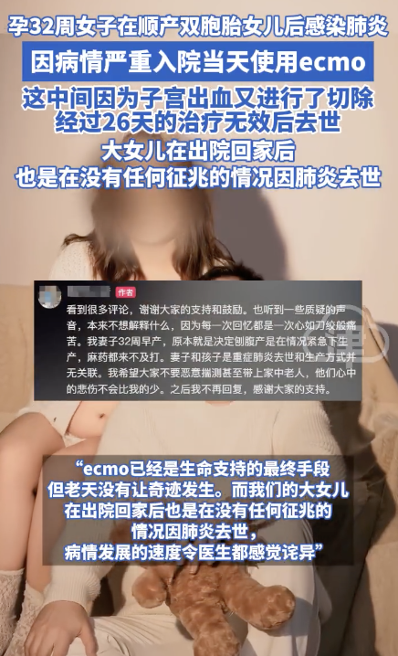 女子早产生双胞胎后感染肺炎去世 悲痛家庭接连失去亲人!5月25日,一名网友发布讣告悼念自己的妻子和孩子。据他所述,他的妻子在顺产双胞胎女儿后感染肺炎,被送往哈尔滨医科大学第一医院重症ICU。由于病情严重,当天便使用了ECMO进行治疗。经过26天的努力,医生们仍未能挽救她的生命。期间,她还因子宫出血接受了切除手术。尽管ECMO是维持生命的最后手段,但奇迹并未发生。