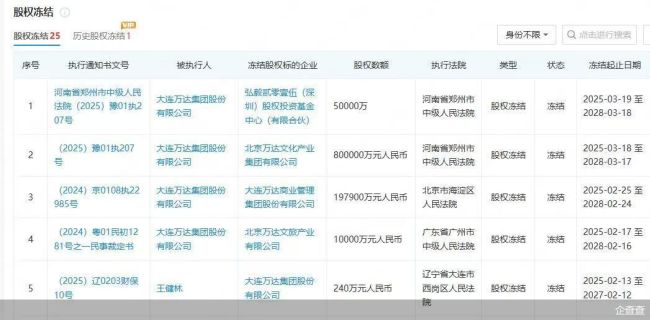 此外,5月8日,王健林所持大连万达商业管理集团股份有限公司3.049亿股权被冻结,冻结期自2025年5月8日至2027年5月7日。