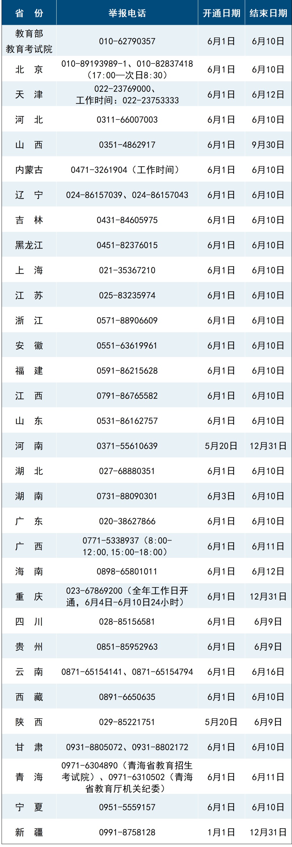 中新网6月3日电 据“微言教育”微信公众号消息,近日,教育部统一公布了教育部以及各省(区、市)2025年的高考举报电话,欢迎广大考生、家长及社会各界人士及时举报反映涉及2025年高考的问题线索。教育部及各省(区、市)将会同有关部门根据举报线索第一时间核查处理,坚决维护高考公平公正。