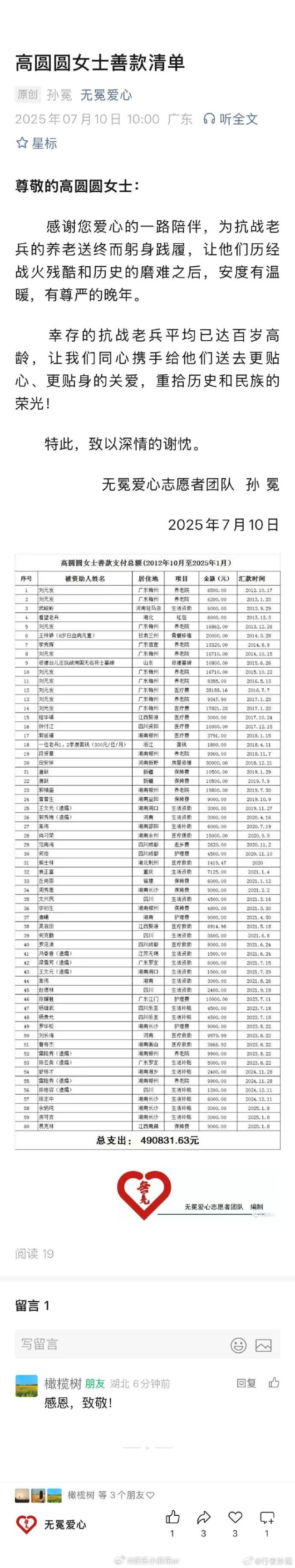 高圆圆为抗战老兵捐款13年,善款近50万,人美心善!