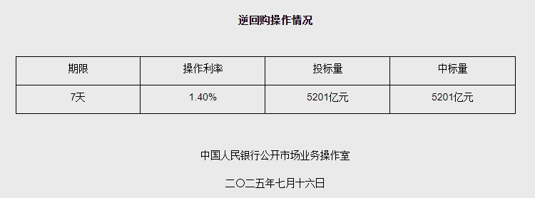 中新网7月16日电 据央行网站消息,2025年7月16日中国人民银行以固定利率、数量招标方式开展了5201亿元逆回购操作。具体情况如下: