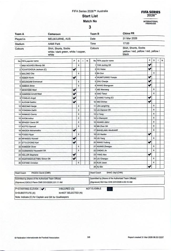 北京时间3月31日14点,FIFA系列赛澳大利亚赛区第二轮比赛开始,中国队对阵喀麦隆队。赛前双方公布了首发名单。