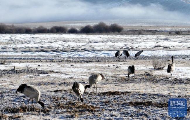 近日,北返迁徙的黑颈鹤在四川省红原县的草原上觅食。这些优雅的鸟类以其独特的姿态和高亢的叫声成为草原上的一道亮丽风景线。3月29日,人们在嘎曲河红原县月亮湾段观察到黑颈鹤正在觅食。