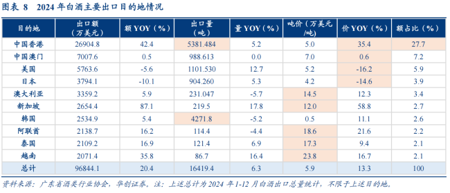 海关统计数据显示,2023年香港占内地白酒出口量的23%,是内地白酒第一大出口区;2024年,香港占内地白酒出口量进一步提升至27.7%。
