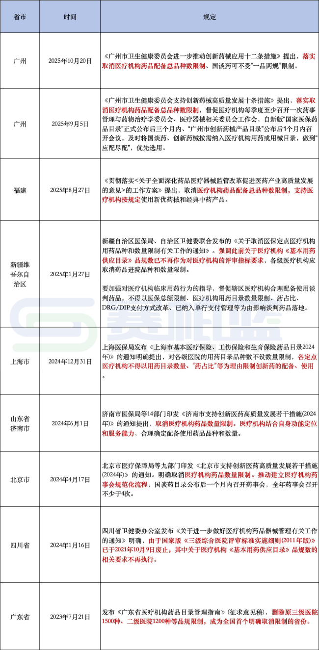 2025年以来,取消医疗机构药品配备总数限制的省市逐渐增加。