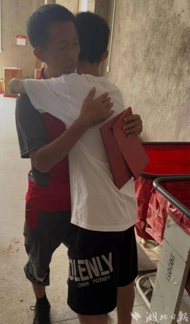陈杰希望尽快与父亲分享这份喜悦。当天,他的父亲陈世兴一早就出去送快递了。在阳新县官桥路的快递站点,陈世兴刚送完快递回来,皮肤晒得黝黑。从儿子手中接过录取通知书,他小心翼翼地展开,仔细看了又看,不善言辞的他紧紧抱住儿子,眼里闪烁着泪光。