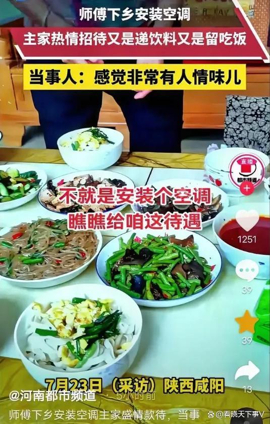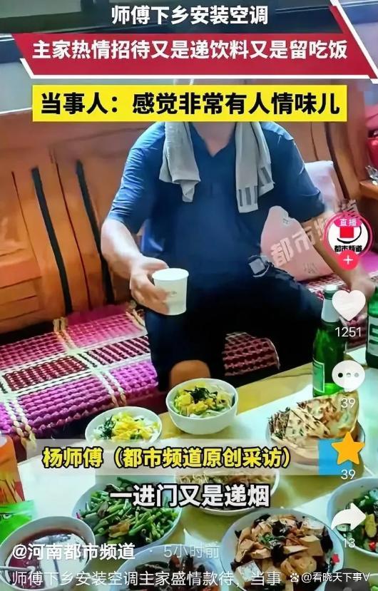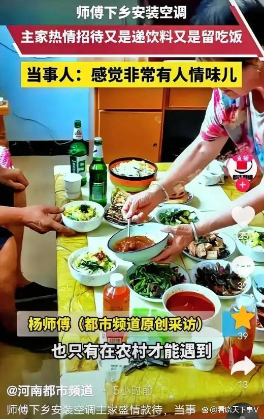 师傅下乡装空调主家留吃饭 乡下人的实在热情!在陕西咸阳,一位男子下乡安装空调时经历了一段难忘的待客之道。刚进门,男主人就递上一根烟,紧接着啤酒和功能饮料被摆上了桌,场面比招待亲戚还要隆重。小哥埋头工作了大半天,装好空调调试完毕正准备离开时,女主人却堵在门口,坚持说在农村不吃饭谁也不能走。男主人也附和,直接拉他进屋,先灌一口啤酒再说。