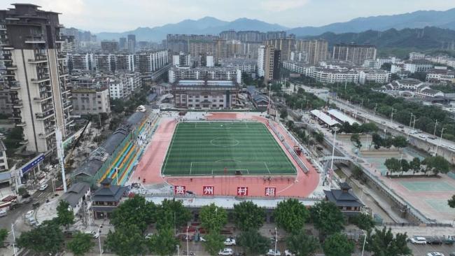 6月24日,洪水侵袭榕江,“村超”主场地沦为重灾区。8000平方米的草坪被淤泥覆盖,塑胶跑道被全部掀起,球场所在街道的商铺全都被浸泡在洪水中。洪水退去后,球场的重建工作逐步推进。200多名工人分为10多个施工小组,分别负责跑道、草皮、看台及电子转播等项目的修复工作,最终按1:1比例还原“村超”球场。
