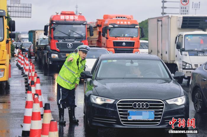 7月30日10时许,暴雨导致外环高速内圈近漕宝路出口处的4号车道积水,上海闵行交警组织路政养护单位临时封闭漕宝路下口开展排水工作,并引导主线车辆绕行。(上海市公安局闵行分局 供图)
