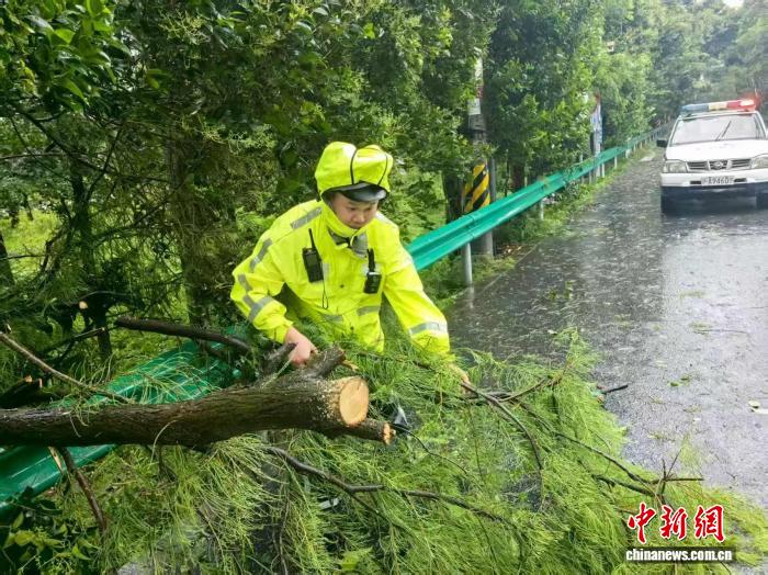 30日7时30分,上海奉贤民警和辅警在巡逻中发现树木倾倒在公路上,使用手持电锯将倾倒的树木清理,迅速恢复交通。(上海市公安局奉贤分局 供图)