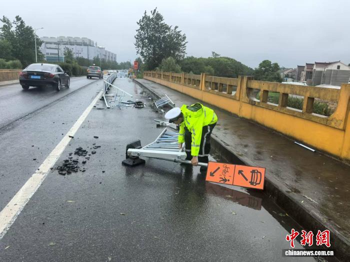 “护栏倒了!”上海市公安局浦东分局交通管理支队民警徐嘉楠刚刚帮道路养护人员清理了路边堵住的排水渠,又发现道路一旁的机非隔离护栏因受强风出现大面积倒伏,完全阻塞了非机动车道,各种碎片也铺满地面。两位民警立即将倒伏的护栏扶正、加固并简单清理了碎片,恢复了该路段的正常交通秩序。