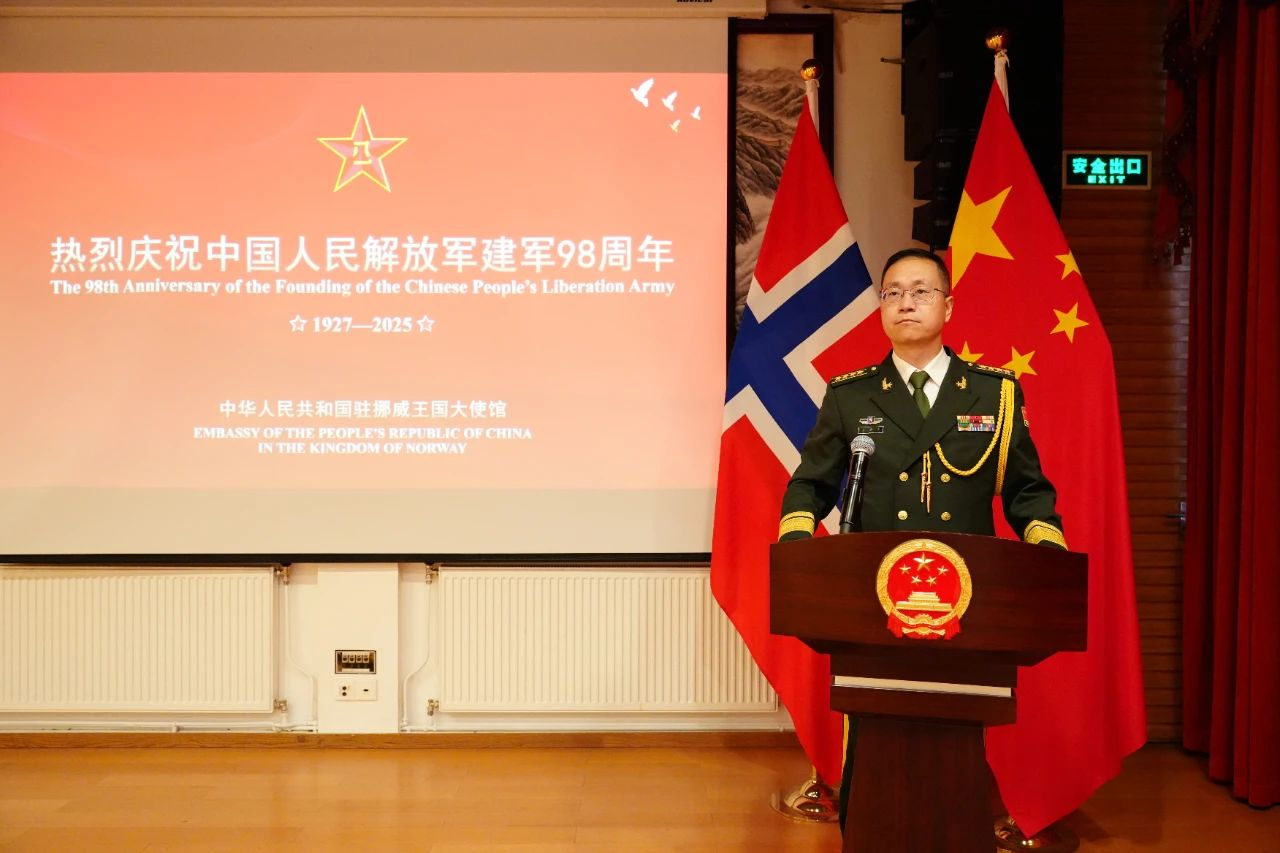 中国驻挪威大使馆国防武官李尚杰大校致辞时表示,98年来,在中国共产党领导下,中国人民解放军始终牢记和践行全心全意为人民服务宗旨,奋力投身为中国人民谋幸福、为中华民族谋复兴的历史使命。今年是纪念中国人民抗日战争暨世界反法西斯战争胜利80周年,中国愿与爱好和平的世界各国一道,坚定维护以联合国为核心的国际体系,坚决反对一切形式的霸权主义和强权政治,推动构建人类命运共同体。