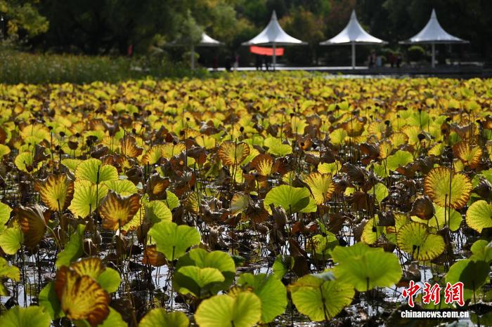 10月11日,内蒙古呼和浩特市,湖内泛黄的荷花叶。中新社记者 刘文华摄