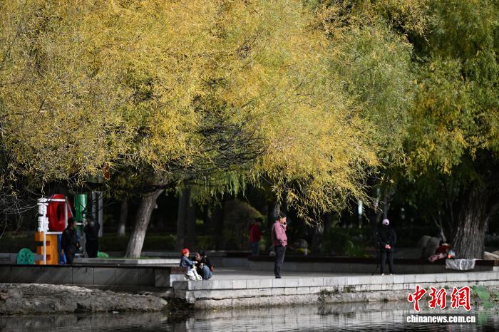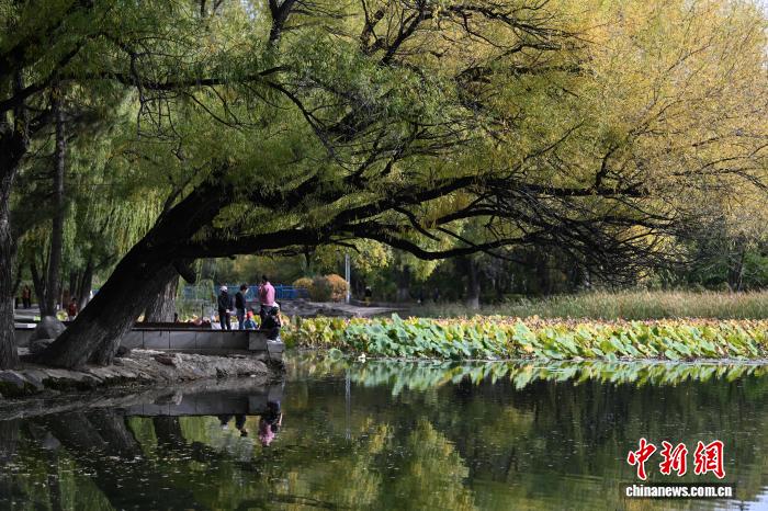 10月11日,内蒙古呼和浩特市,民众在湖边放松。中新社记者 刘文华摄