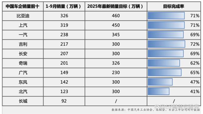 传统车企新能源目标完成率向好。前三季度中国车企最新销量数据公布,整体行业表现稳健。根据汽车行业协会的数据,2025年前三季度汽车行业继续保持稳中向好的发展态势。