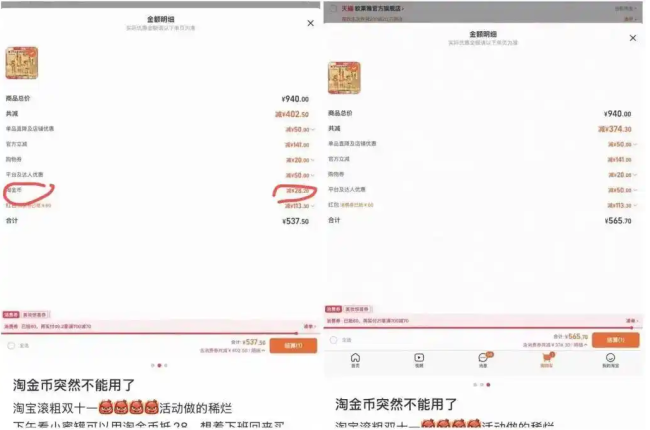 当晚,大量网友晒图反馈淘金币问题,尚未付尾款的商品秒贵几十元至数百元。“我看广告、做任务,辛辛苦苦刷出来的淘金币,就是为了双十一。为什么不给用?”有网友写道。