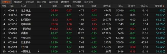 沪深两市成交额合计为1.46万亿元,较前一交易日缩量约2533.82亿元。具体来看,沪市成交额为6231.02亿元,深市成交额为8356.48亿元。北方稀土以144.71亿元的成交额位居首位,紧随其后的是东方财富、包钢股份、药明康德和中际旭创,成交额分别为99.37亿元、63.21亿元、61.09亿元和57.81亿元。