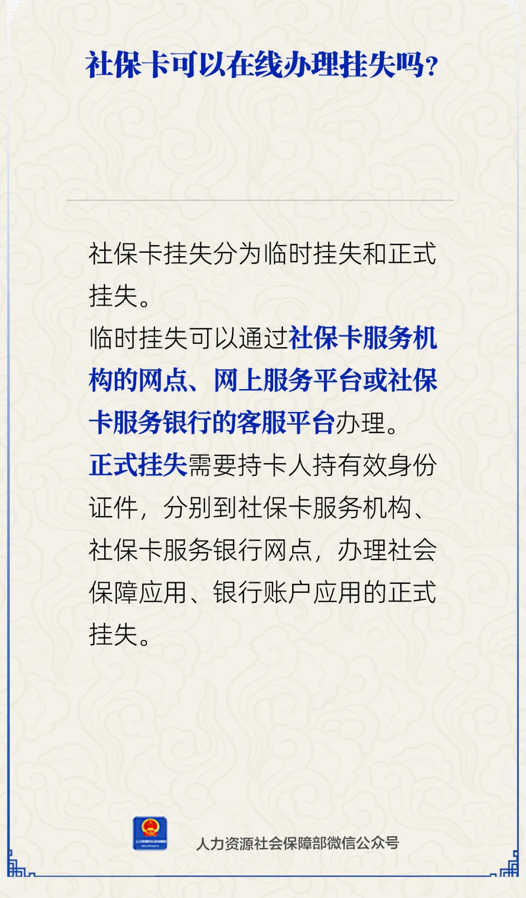 中新网7月16日电 社保卡可以在线办理挂失吗?人社部16日通过官方微信公众号作出解答。