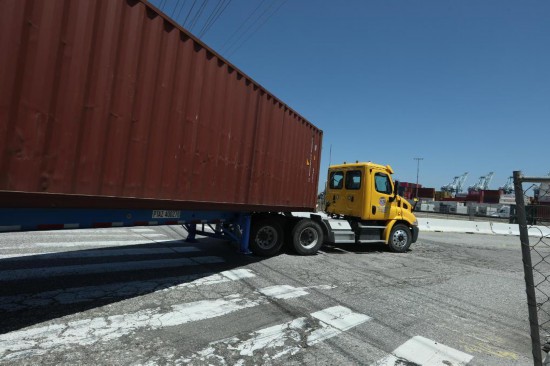 这是4月29日在美国洛杉矶港拍摄的卡车。新华社发(邱晨摄)