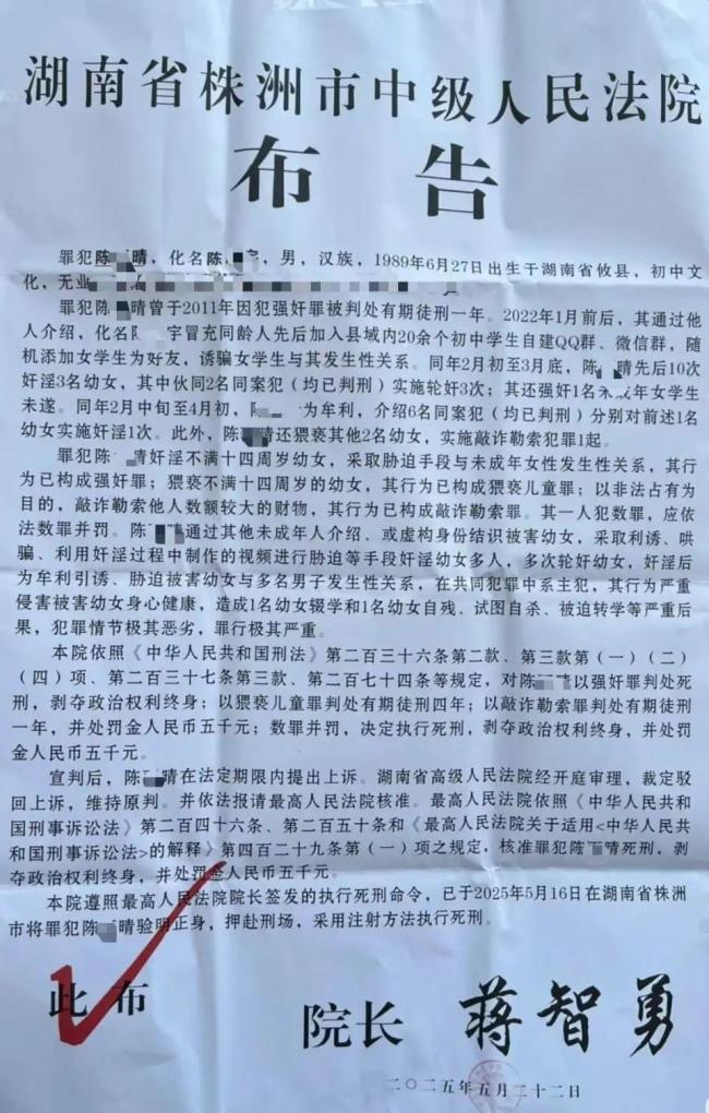 湖南陈某晴被执行死刑 罪行极其严重引发关注!近日,在湘潭市中级人民法院门口的布告栏上,张贴了一则株洲市中级人民法院的布告。布告显示,湖南株洲攸县一名男子假扮初中生,诱骗女学生与其发生性关系,先后多次强奸、轮奸多名幼女,并介绍同案犯强奸幼女,用视频胁迫对方,造成女生自残、被迫转学等严重后果。