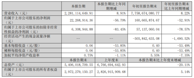 2025年前三季度,经营活动产生的现金流量净额为-5.06亿元,相比上年同期的正值3180万元,由净流入转为净流出,同比降幅达到1,690.52%。公司在报告中解释,这一变化“主要系本期经营性采购支出增加所致”。