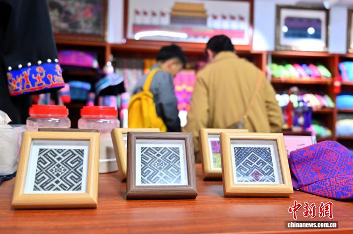 图为各类壮锦产品吸引参观者拍摄。俞靖 摄