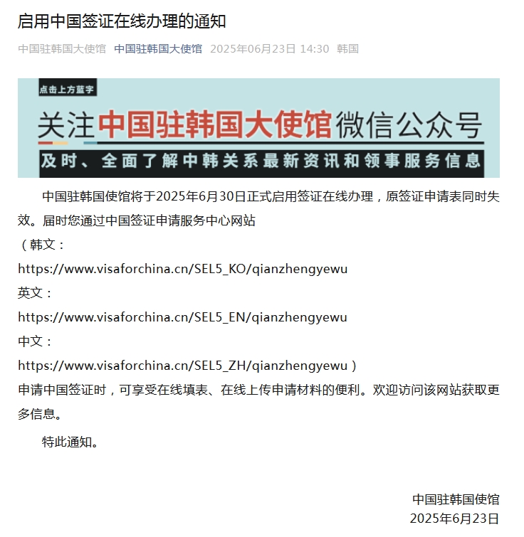 中新网6月23日电 据中国驻韩国大使馆微信公众号消息,中国驻韩国使馆将于2025年6月30日正式启用签证在线办理,原签证申请表同时失效。届时通过中国签证申请服务中心网站(韩文:https://www.visaforchina.cn/SEL5_KO/qianzhengyewu;英文:https://www.visaforchina.cn/SEL5_EN/qianzhengyewu;中文:https://www.visaforchina.cn/SEL5_ZH/qianzhengyewu)申请中国签证时,可享受在线填表、在线上传申请材料的便利。欢迎访问该网站获取更多信息。