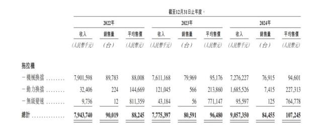 2022年-2024年,公司拖拉机产品平均售价分别为88245元/台、96480元/台和107245元/台,同期,销量由90019台降至84455台。