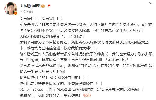 当晚,周深发文回应:“不好意思让你们担心了,录制节目难免有些磕磕碰碰,放心我没有大碍。”