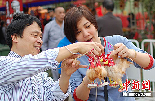 广州黄埔“波罗诞”千年庙会上,工艺品“波罗鸡”深受游客喜爱。(资料图)